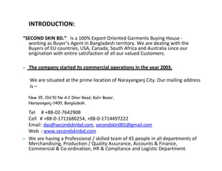 Second Skin BD is a Bangladeshi garment buying house established in 2003. They have a team of 45 professionals across merchandising, production, quality assurance, finance, compliance, and logistics. They specialize in knitwear like t-shirts, polo shirts, and underwear. As a buying agent, they can offer competitive pricing, product development support, short lead times, and access to multiple certified factories in Bangladesh. They have detailed processes to ensure quality from fabric inspection to final product checking before export.