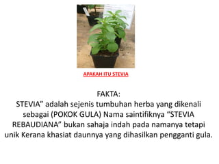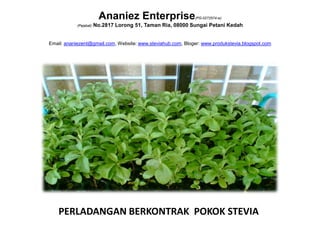 Dokumen ini membincangkan perladangan pokok stevia, menggariskan fakta tentang stevia sebagai pemanis semulajadi yang tidak mengandungi kalori, serta manfaat kesihatannya. Ia juga menetapkan perjanjian perladangan berkontrak antara Ananiez Enterprise dan rakan niaga untuk pembelian dan penjualan hasil stevia. Selain itu, dokumen ini memberikan panduan tentang cara penanaman dan penjagaan pokok stevia untuk memastikan hasil yang optimum.