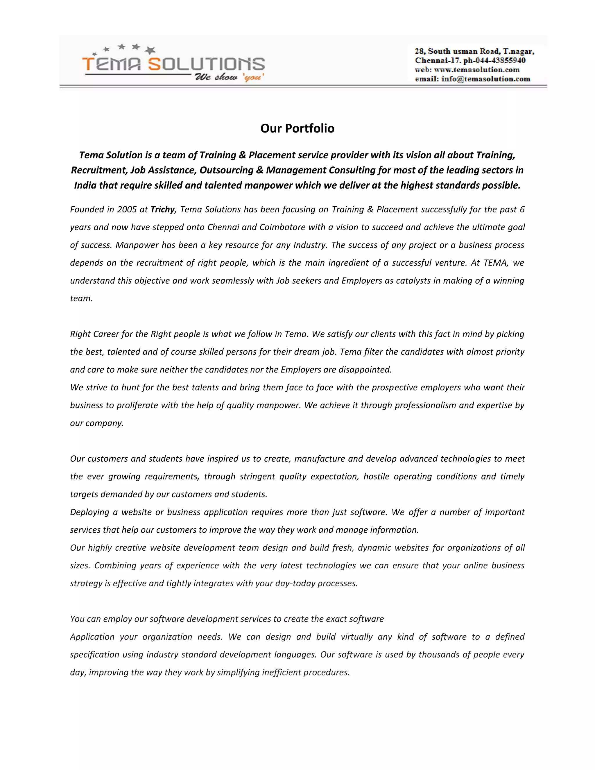 Tema Solution is a training and placement services provider focused on sectors in India requiring skilled workers. Founded in 2005 in Trichy, it has since expanded to Chennai and Coimbatore. The company understands that manpower is key to business success and works to match job seekers with employers. Tema Solution provides training for engineering fields like mechanical, aeronautical and software development. It also assists with project development, recruitment, and corporate training.