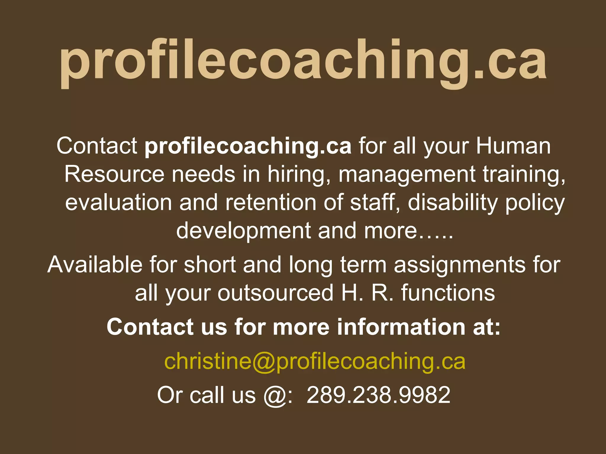 The document provides information about the services offered by profilecoaching.ca related to human resources functions such as hiring, training, evaluations, disability policies, and outsourcing HR needs. It discusses their assistance with developing HR manuals, the hiring process, job descriptions, interviews, reference checks, legal implications, employment offers, goal setting, performance reviews, disability management, outplacement services, and business consulting. Contact information is provided to learn more.