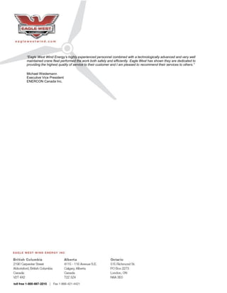 Eagle West Wind Energy Inc. successfully completed multiple wind farm projects across Canada, including installations of Enercon and Siemens turbines, showcasing their expertise in overcoming challenging conditions such as extreme weather and difficult terrains. These projects, such as the Castle Rock Ridge and Bear Mountain wind farms, collectively generate significant renewable energy enough to power tens of thousands of homes. The company is recognized for its safety standards, efficient execution, and high-quality service in the wind energy sector.
