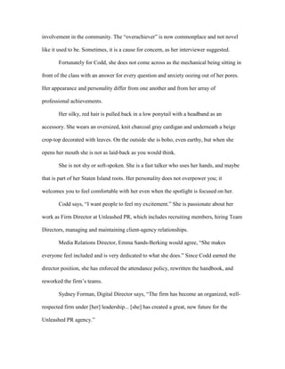 Caroline Codd holds many roles including co-founder of a campaign, blogger, and director of a PR firm while being a student at Boston University. She has a passion for many areas and does not want to limit herself, though others see her as "all over the place". Codd is dedicated to her work with the student-run PR firm, improving processes and building its reputation. She manages her busy schedule through organization and time management. Codd hopes to eventually work in nonprofit communications and sees value in gaining diverse experiences rather than focusing on one area alone.