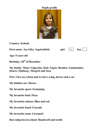 This document contains profiles for 20 Icelandic students between the ages of 9-10. Each profile provides the student's name, age, birthday, family, pets, hobbies, favorite sports, foods, colors, musicians, teams, and best school subjects. Common favorites among the students include soccer, gymnastics, pizza, Cascada, and the colors blue and red. The students come from farm families and have experience with animals like horses, cows, sheep, and dogs.