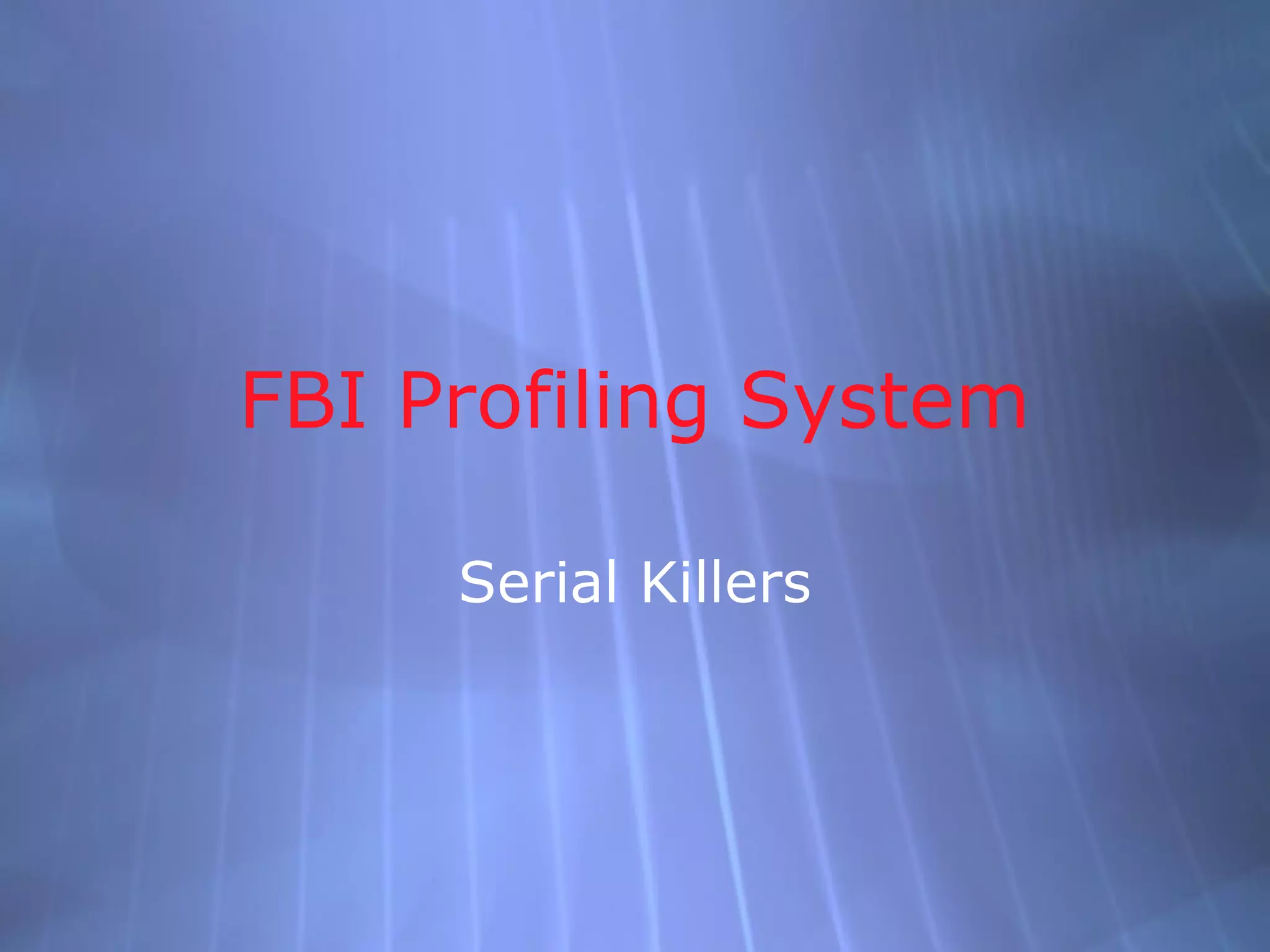 This document provides information about serial killers from an FBI profiling perspective. It defines serial killers as those who murder 2 or more victims with a cooling off period between killings. It profiles some of the most notorious American and international serial killers. It discusses characteristics of organized and disorganized killers. The document also examines profiling techniques used to understand crime scenes and killer psychology/motivations. Fantasy is identified as playing a key role in the development of serial killers. Survival tips are also presented.