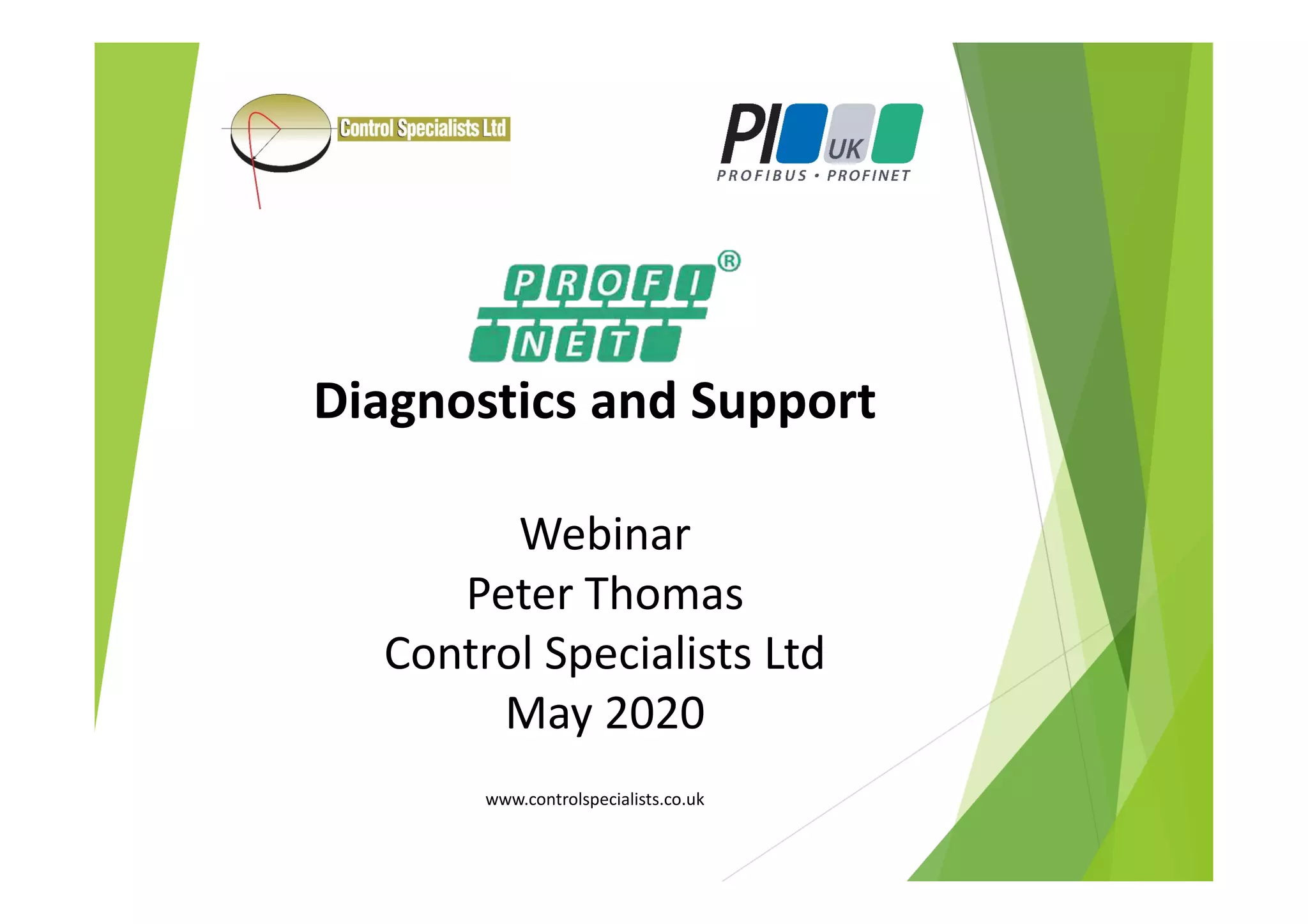 This webinar presentation provides information on diagnosing PROFINET networks. It discusses various diagnostic tools that can be used, including those within IO controllers, switches, and third-party hardware and software. Specific tools covered are active and passive diagnostic devices, Ethernet frame analyzers, port mirroring, and Ethernet taps. The presentation emphasizes the importance of proper network design and qualification to ensure issues can be identified and supported. Control Specialists offers various PROFINET training courses.