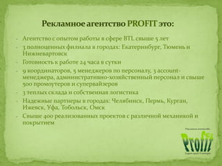 Агентство Profit имеет более 5 лет опыта в сфере BTL и успешно реализовало более 400 проектов в различных городах России, включая Екатеринбург, Тюмень и Нижневартовск. В команде работают 9 координаторов и свыше 500 промоутеров, что позволяет осуществлять масштабные акции, включая дегустации, вечеринки и рекламные кампании для известных брендов. Агентство также предоставляет услуги по организации мероприятий, обучая персонал и обеспечивая логистику для различных корпоративных клиентов.