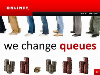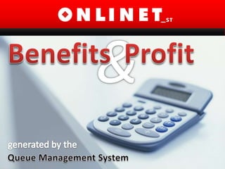 The document outlines the benefits of a queue management system for banking and finance, highlighting improved customer service, reduced waiting times, and increased staff productivity. It details the processes involved, including pre-registration, service selection, and feedback, and emphasizes financial benefits such as cost reductions and increased sales. The Onlinet Group, a leader in developing these systems, aims to enhance customer and staff satisfaction across various sectors.