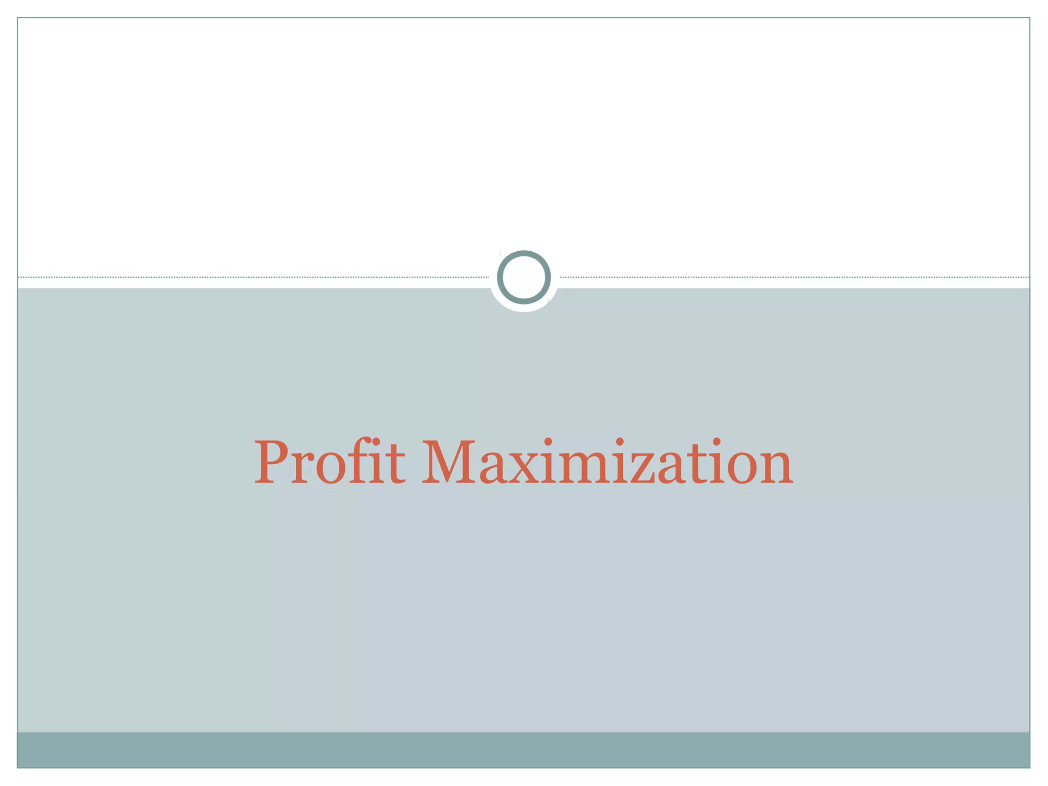 The document discusses the concept of profit maximization for firms. It states that firms aim to maximize profits by producing at the quantity where marginal revenue equals marginal cost. Marginal revenue is the change in total revenue from selling one more unit, while marginal cost is the change in total cost from producing one more unit. The profit-maximizing level of output occurs when marginal revenue and marginal cost are equal, as this is where profits are highest.