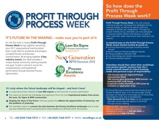 The document provides information about the Profit Through Process Week, which brings together three key industry events focused on business process transformation. It provides an overview of the two main summits included in the week - the 12th Annual Lean Six Sigma & Process Improvement Week and the 18th Annual Next Generation BPM Summit. Details are given about the agenda, sessions, and opportunities for networking and learning for process excellence professionals at different levels and from different industries.