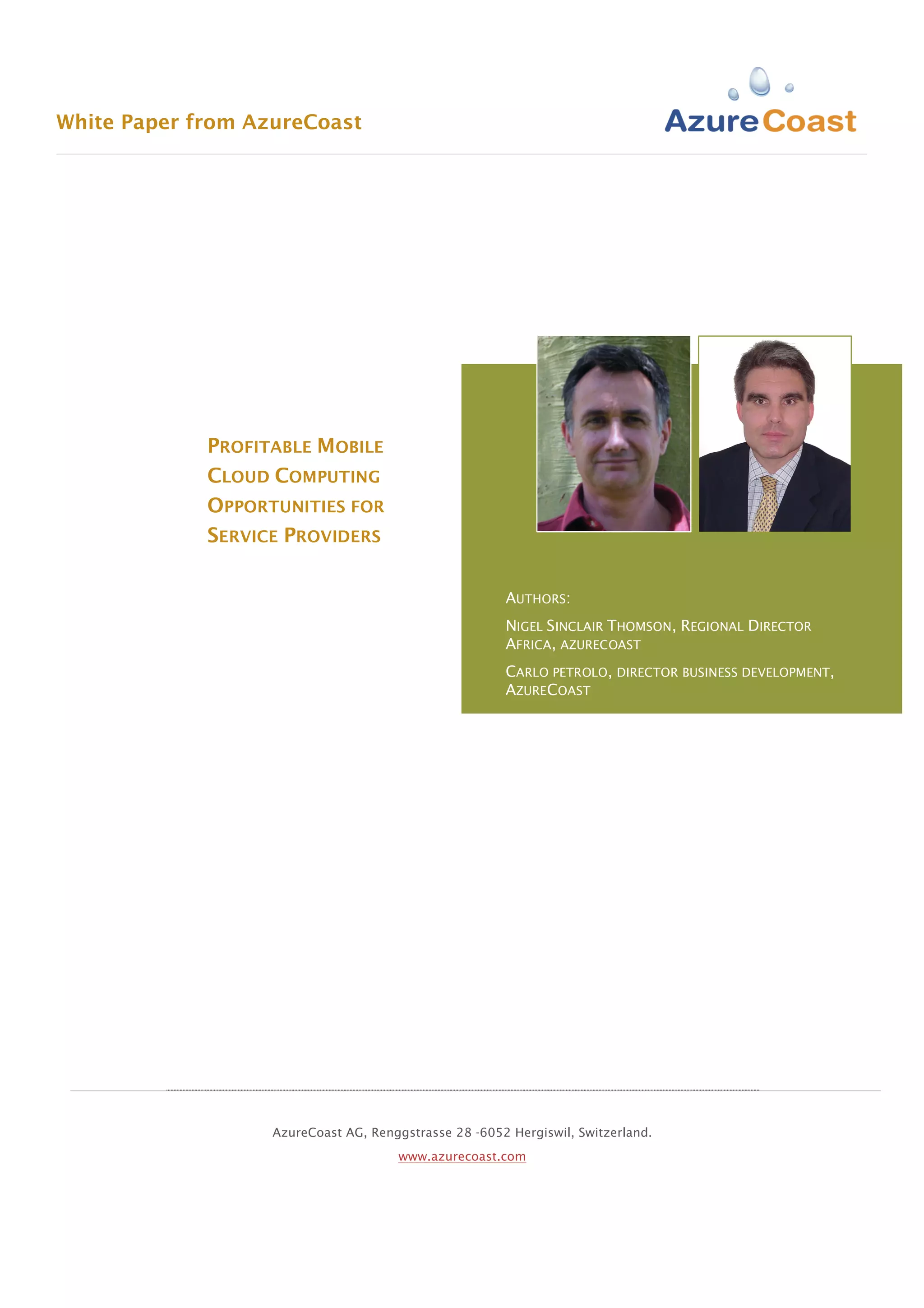 This white paper by Azurecoast discusses the challenges faced by service providers in the mobile telecommunications market due to declining voice revenues and increased competition from over-the-top (OTT) operators. It outlines the opportunities mobile cloud computing presents as a means to generate value-added services while leveraging existing strengths such as customer relationships and high-speed networks. Additionally, it examines recent innovations in mobile cloud services by various providers as they adapt to these market shifts.
