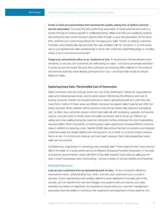The document discusses four key strategies for companies to achieve profitable and sustainable revenue growth during an economic downturn: 1) Focus on existing customer accounts by deepening relationships and tailoring offers; 2) Ensure every sales opportunity is captured through efficient upselling and cross-selling; 3) Reduce the cost to serve customers by empowering associates with tools to work smarter; and 4) Maintain a strong focus on service quality to differentiate the brand in the marketplace.
