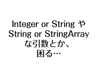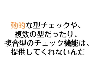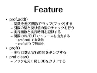 – – // ライブラリ(lib)のAPIの型情報を登録 prof.add( 'lib.fn1()', 'lib.fn2(a:Integer/String = ",", b:Object):Object', 'lib.fn3(...:Mix):Array', 'lib.fn4(a:Mix):Boolean' ); // ネイティブオブジェクトの動的な型チェックも可能 prof.add( 'String#hoge(a:Mix,b:Mix,c:Mix):String' );