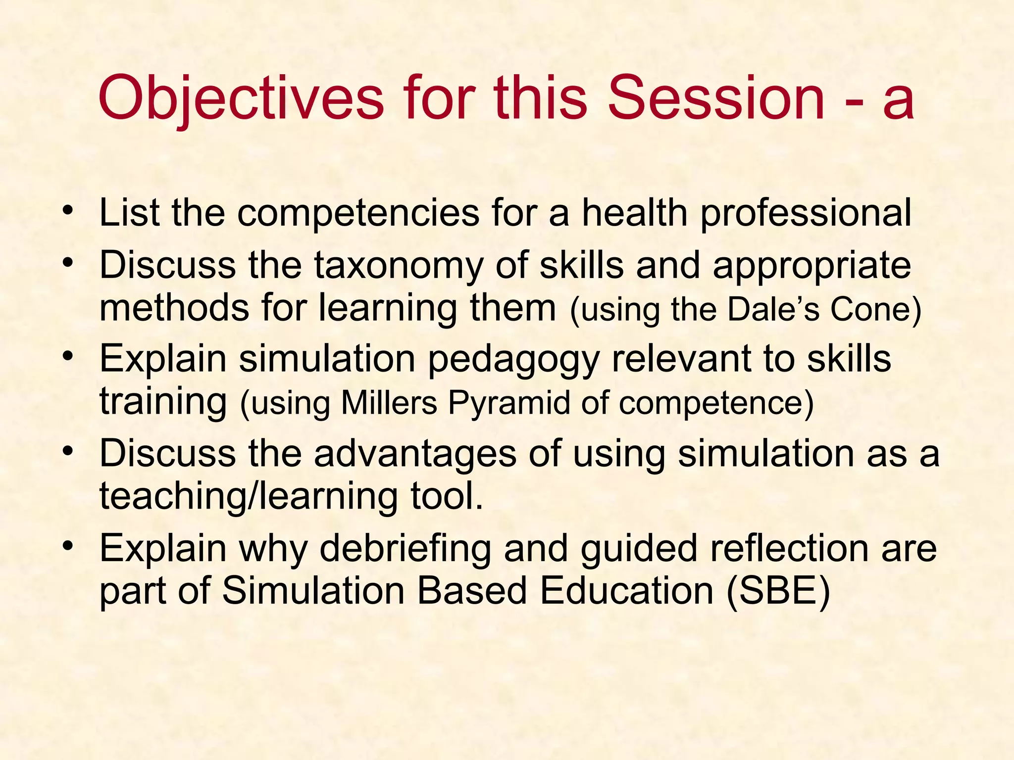 This document discusses clinical skills training and simulation pedagogy. It outlines various objectives of the session which include listing competencies for health professionals, discussing taxonomy of skills and methods for learning them using Dale's Cone model. It also explains simulation pedagogy using Miller's Pyramid of competence and discusses advantages of using simulation as a teaching tool, including how debriefing and reflection are important parts of simulation-based education. The document provides examples of skills that can be taught via simulation and examines research on implementing simulation effectively in learning.