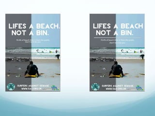 The document contains ideas for creating promotional materials for the organization Surfers Against Sewage. It includes four initial ideas for a campaign poster, with the first idea being selected to develop further. It also includes draft designs for a membership form and merchandise items like t-shirts, mugs, and surfing accessories, with an emphasis on using the organization's color scheme and logo. The merchandise ideas range from inexpensive stickers to more expensive items like surfboards to appeal to different member levels.