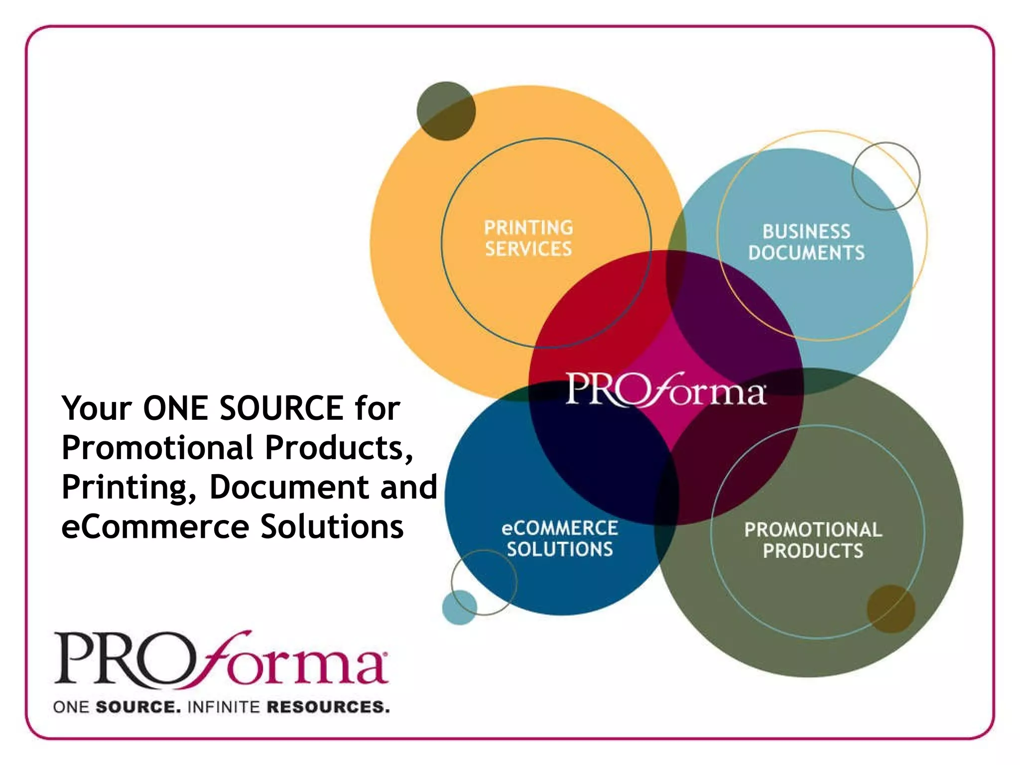 Proforma is a leading provider of promotional products, printing services, business documents, and ecommerce solutions. They have over 30 years of experience and can serve as a one-stop-shop or "one source" for all of a company's graphic communication needs. Proforma has the resources and expertise to develop customized solutions that help businesses reduce costs, increase efficiencies, and strengthen their brand.