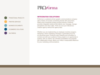 Proforma is a graphic communications company that provides integrated marketing solutions to connect brands with their audiences through various promotional products and campaigns. The document highlights several successful projects with clients like Teknion, Bally Technologies, and Indiana University, showcasing creative strategies and outcomes such as enhanced brand awareness, increased sales, and improved employee engagement. Overall, Proforma emphasizes its role as a full-service creative agency capable of delivering measurable results without traditional agency fees.