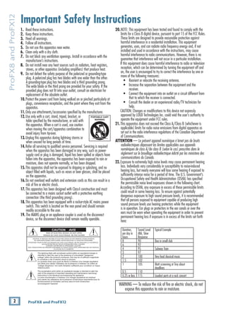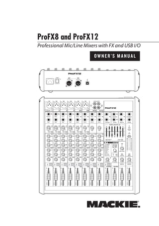 The document is an owner's manual for the ProFX8 and ProFX12 professional microphone/line mixers. It contains 3 pages of instructions and safety information for operating the mixers, including how to set levels on the mono, hybrid, and stereo channels, how to mix using the channel and main faders, how to use the USB connection to play and record audio, and important notes on powering up and shutting down the system safely. The manual provides concise directions for using the key features of the mixers while ensuring safe operation.
