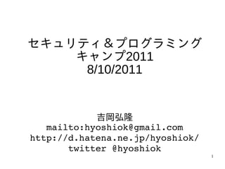 キャンプ2011 8/10/2011 吉岡弘隆 mailto:hyoshiok@gmail.com http://d.hatena.ne.jp/hyoshiok/ twitter @hyoshiok 1