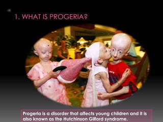 Progeria is a rare genetic disorder that causes children to age rapidly, experiencing problems usually seen in the elderly like heart disease, stiffness of joints, and loss of hair and body fat. It affects around 50 children worldwide. Children with Progeria appear to have the appearance of an elderly person and most die of heart attacks or strokes at an average age of 13 years old. There is no cure for Progeria but treatments can help manage symptoms and delay the effects of aging.