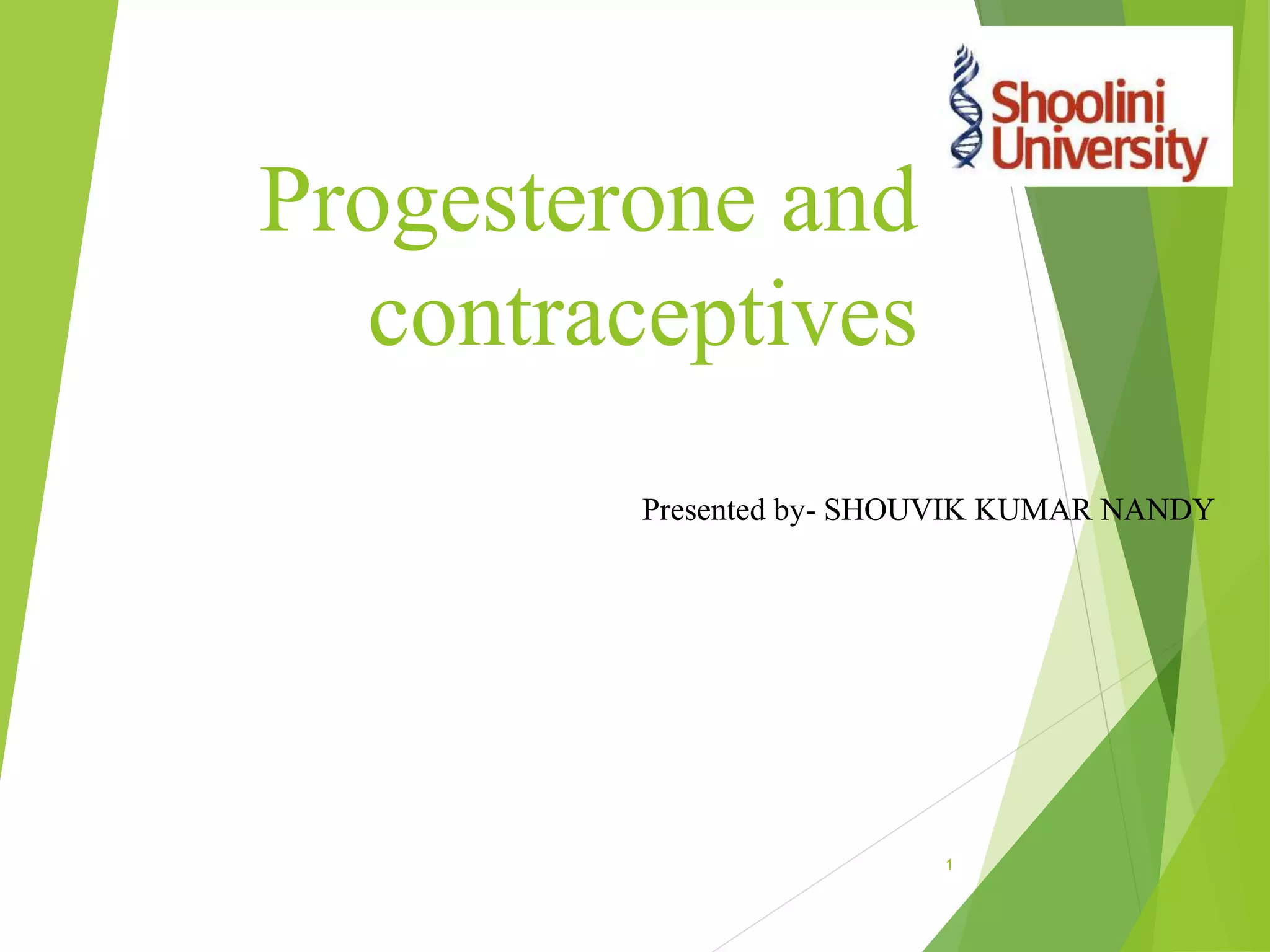 Progesterone is a steroid hormone produced in ovaries and testes that promotes endometrial development and inhibits ovulation. It works by negatively feedbacking at the hypothalamus to decrease gonadotropin release from the pituitary gland. Synthetic progestogens are used in contraceptives due to their stability. Contraceptives prevent pregnancy through a combination of estrogen suppression of LH and FSH and progestin thickening of cervical mucus. Common contraceptive methods include oral pills, transdermal patches, injections, and implants containing estrogen and progestin combinations. Adverse effects include breast changes, fluid retention, headaches and changes in mood and libido.
