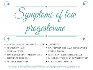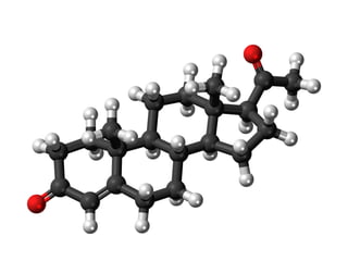 Progesterone is a steroid hormone produced in the corpus luteum, placenta, testes, and adrenal cortex that plays several key roles in the menstrual cycle and pregnancy. It causes development of the uterine lining after ovulation, increases basal body temperature, and supports a successful pregnancy by decreasing the mother's immune response and triggering labor when levels drop. Low progesterone can cause issues like infertility, depression, and menstrual problems, while high levels may lead to headaches and moodiness. Progesterone therapy has been shown to help treat various conditions by its anti-inflammatory, blood thinning, and neuroprotective effects.