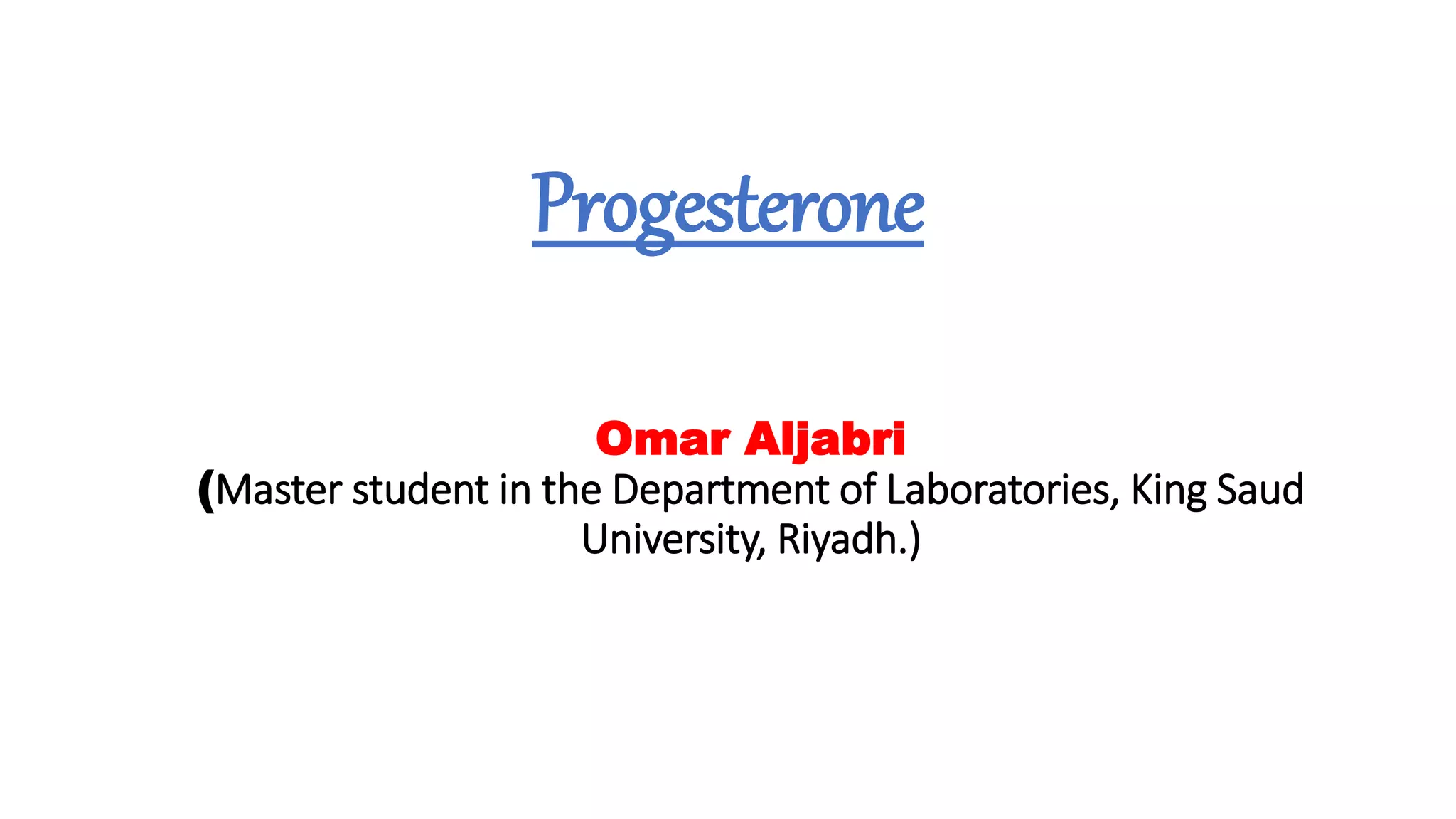 Progesterone is a steroid hormone involved in the menstrual cycle, pregnancy, and embryo development in humans. It is formed in the corpus luteum during early pregnancy and the placenta during late pregnancy. Progesterone binds to receptors found throughout the body, including the central nervous system, endocrine system, and reproductive system. Physiologically, progesterone prepares the uterus for pregnancy, prevents uterine contractions, and supports the corpus luteum until the placenta can secrete progesterone in later stages of pregnancy. Normal progesterone levels fluctuate throughout the menstrual cycle and pregnancy. Both low and high progesterone can cause various symptoms and may be due to conditions like hypothyroidism, menopause, or cancers.