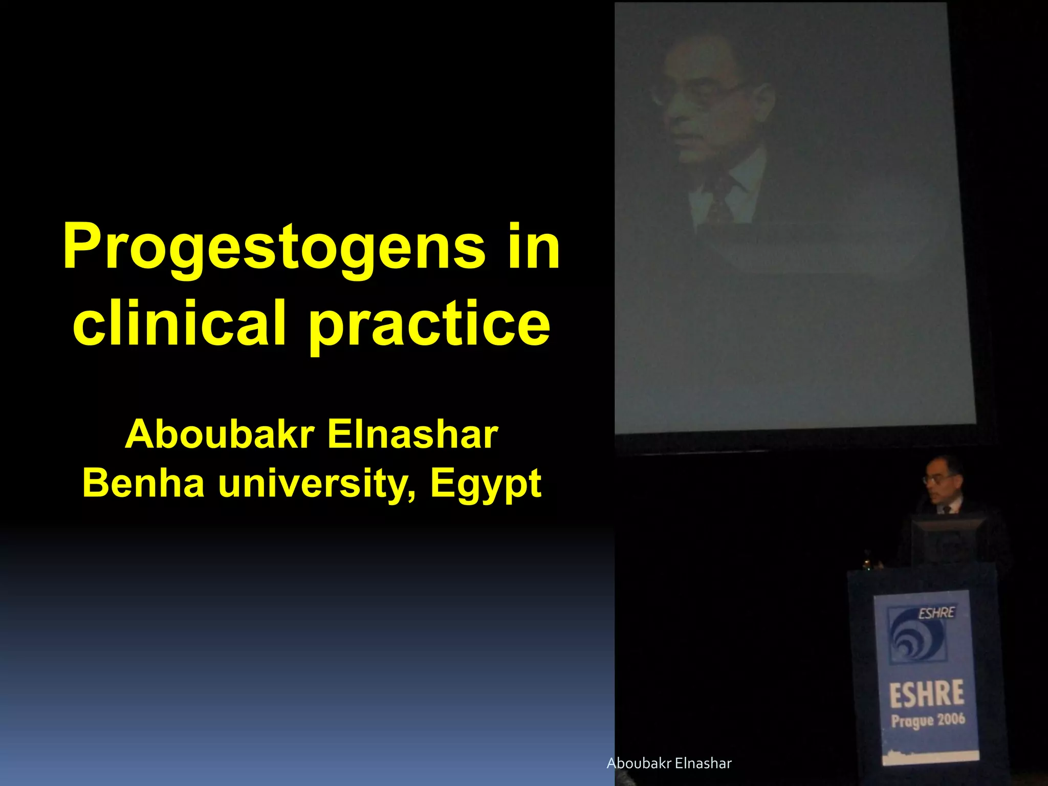 The document discusses progestogens, which include progesterone and synthetic progestins. Progesterone is secreted naturally, while progestins have progesterone-like effects. Both are used for obstetric and gynecologic purposes. Therapeutically, progestogens are used to support early pregnancy, treat menstrual disorders, provide luteal phase support in assisted reproduction, and relieve symptoms of conditions like endometriosis. While generally effective, studies on uses like threatened miscarriage and preterm labor have been limited by small sample sizes. Natural progesterone generally has fewer side effects than progestins. The document examines various progestogen types and routes of administration.