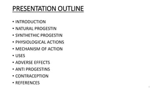 Progesterone is a natural hormone that prepares the uterus for pregnancy and helps maintain pregnancy. It can be produced naturally by the body or synthesized for medical uses. Progesterone has physiological actions in the uterus, cervix, vagina, breasts, central nervous system, and elsewhere to support pregnancy. It works by binding to progesterone receptors and regulating gene transcription. Progesterone and progestins are used for contraception, hormone replacement therapy, dysfunctional uterine bleeding, threatened miscarriage, endometriosis, and other conditions. Common side effects include changes in menstruation, headaches, and breast tenderness.