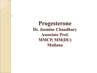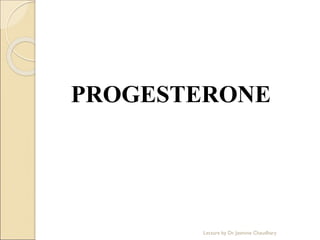 The document discusses progesterone, a hormone secreted by the corpus luteum and placenta that prepares the uterus for pregnancy and maintains pregnancy. It is synthesized from cholesterol and has various synthetic derivatives that were developed due to its degradation in the liver. These derivatives include 17α-hydroxy progesterone, 19-nortestosterone, and others created by modifying these structures. Progesterone and its derivatives have various uses including preventing abortion and supporting pregnancy, as well as side effects like nausea.