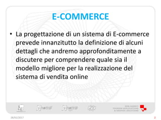 Il documento discute i vari aspetti necessari per progettare un sistema di e-commerce, inclusi la definizione del mercato, la logistica, il packaging, le modalità di pagamento e le condizioni di vendita. Viene sottolineata l'importanza della privacy e delle comunicazioni legali necessarie, oltre a suggerimenti per la promozione e la gestione dei costi. Infine, si conclude con un invito ad avviare il negozio online.