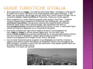 Il documento è una guida turistica per organizzare viaggi in Italia, proponendo itinerari in diverse località, tra cui Napoli e San Marino, con un focus su cultura, arte e gastronomia. Si evidenziano attrazioni come il centro storico di Napoli, patrimonio dell'UNESCO, e l'importanza di San Marino come repubblica storica. La guida include informazioni pratiche, come mappe, audio guide e suggerimenti per la cucina locale, rendendo ogni visita un'esperienza ricca e memorabile.