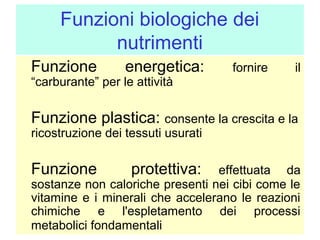 Il documento fornisce informazioni sulle funzioni biologiche dei nutrimenti, descrivendo i vari gruppi alimentari e le loro funzioni, come quella energetica, plastica e protettiva. Vengono inoltre presentate strategie per una dieta equilibrata, con suggerimenti sull'assunzione moderata di zuccheri, la scelta di cibi ricchi di fibre e l'importanza delle proteine e dei minerali. Infine, si sottolinea la necessità di evitare un eccesso di sodio e l'importanza del calcio per la salute delle ossa.
