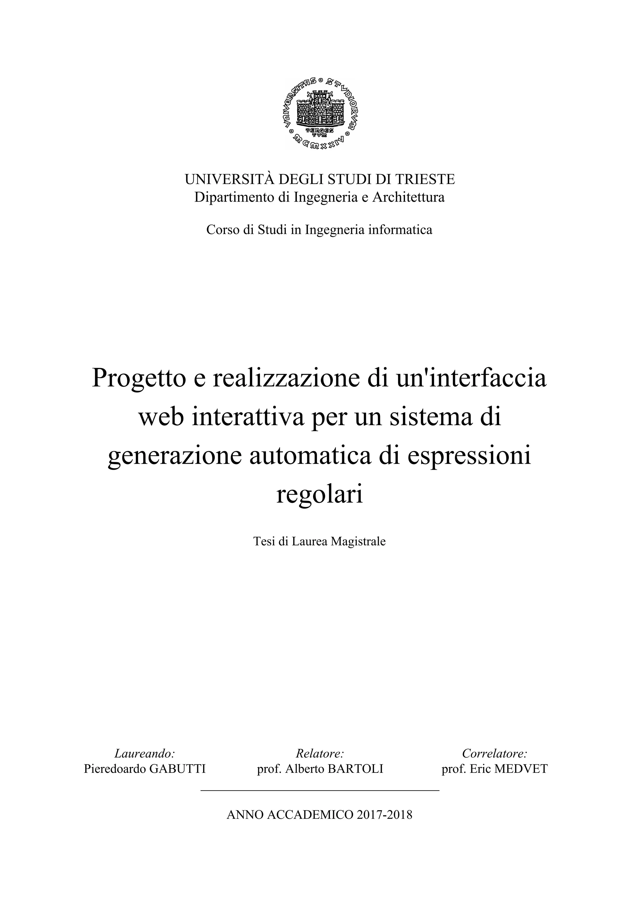La tesi di Pieredoardo Gabutti propone la creazione di un'interfaccia web interattiva per la selezione automatica di espressioni regolari, migliorando l'estrazione di testi in base ad esempi forniti dall'utente. Utilizzando un metodo di apprendimento attivo, l'interfaccia interagisce con un back end per ottimizzare la selezione delle espressioni, offrendo un sistema intuitivo e rapido per l'utente. Il sistema è sviluppato presso il machine learning lab dell'Università di Trieste e utilizza tecnologie web come HTML, CSS e JavaScript.