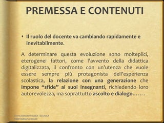Il documento tratta dell'evoluzione del ruolo del docente, influenzata da fattori come la didattica digitalizzata e la crescente interazione con studenti. Viene presentato il progetto 'punto edu' della scuola S. Freud, mirato alla formazione continua del personale docente attraverso un'aula virtuale e una cooperazione attiva. Gli obiettivi includono la creazione di un gruppo di docenti collaborativi e la sensibilizzazione all'importanza della formazione permanente.