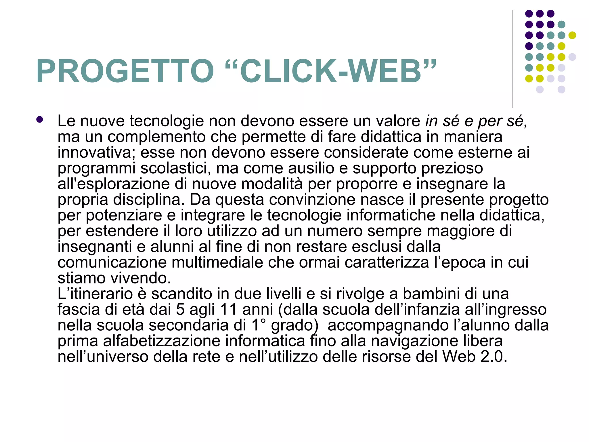 Il progetto "click-web" mira a integrare le tecnologie informatiche nella didattica per alunni dai 5 agli 11 anni, promuovendo l'uso creativo e attivo del computer per migliorare l'apprendimento e favorire processi di socializzazione. Attraverso un percorso didattico strutturato in unità di apprendimento, il progetto si propone di sviluppare competenze informatiche, comunicative e collaborative negli studenti, utilizzando strumenti e risorse del web 2.0. Gli obiettivi includono l'educazione alla multimedialità, la personalizzazione delle attività didattiche e la promozione di esperienze di scambio e interazione tra alunni di diverse scuole.