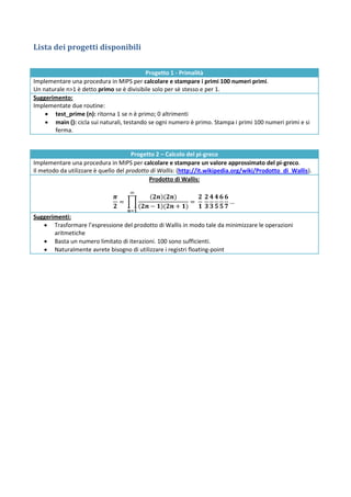 Il documento descrive un progetto in MIPS assembly che richiede lo sviluppo di un programma, la sua simulazione e la redazione di una relazione. Gli studenti possono lavorare singolarmente o in coppie, scegliendo tra progetti predefiniti o proponendone di nuovi da approvare dal docente. Sono forniti dettagli su diversi progetti, che includono algoritmi come il calcolo dei numeri primi, il calcolo del pi-greco, e la simulazione di una macchina del caffè.