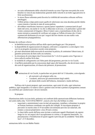 Il documento propone un'animazione nell'area Cecchi durante il periodo natalizio, mirando a valorizzare la vita sociale ed economica attraverso la creazione di un mercatino di Natale e attività comunitarie con il coinvolgimento di residenti, commercianti e associazioni. Si prevede un approccio collaborativo per raccogliere idee e pianificare eventi dal 8 al 13 dicembre, promuovendo attività culturali e di solidarietà. L'obiettivo è rivitalizzare l'area, migliorandone l'attrattiva e stimolando la partecipazione dei cittadini.