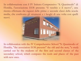 L'associazione eos, in collaborazione con l'IV istituto comprensivo 'S. Quasimodo' di Floridia, presenta un progetto di ricerca che confronta strumenti e luoghi del passato con quelli moderni, condotto dagli studenti delle prime e seconde classi. Il progetto ha coinvolto anche il museo etnografico 'Nunzio Bruno' e diverse figure scolastiche, evidenziando cambiamenti in vari aspetti della vita quotidiana nel comune di Floridia. L'iniziativa include una serie di esempi concreti, come arnesi da lavoro e trasformazioni di strade e spazi pubblici.