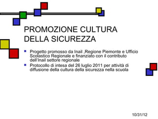 Il documento descrive il progetto 'La scuola si-cura di me', promosso da INAIL, Regione Piemonte e Ufficio Scolastico Regionale, volto a diffondere la cultura della sicurezza nelle scuole attraverso attività formative e coinvolgimento della comunità. Il progetto coinvolge oltre 2800 alunni e cerca di accrescere la consapevolezza dei rischi, con attività come prove di evacuazione e la creazione di materiali didattici. Tra le iniziative, si segnala la realizzazione di DVD e CD multimediali sulla sicurezza e attività di sensibilizzazione per docenti e genitori.