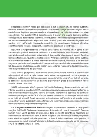 Il documento discute l'importanza dell'Health Technology Assessment (HTA) come strumento per garantire la sostenibilità e l'equità nell'accesso alle cure sanitarie. In particolare, viene proposto di considerare l'HTA come un diritto umano, evidenziando la necessità di un approccio scientifico e trasparente nell'allocazione delle risorse sanitarie. Il congresso nazionale dell'HTA prevede sessioni dedicate a questo tema, coinvolgendo esperti di diverse discipline nel riflessione su come migliorare i sistemi sanitari.