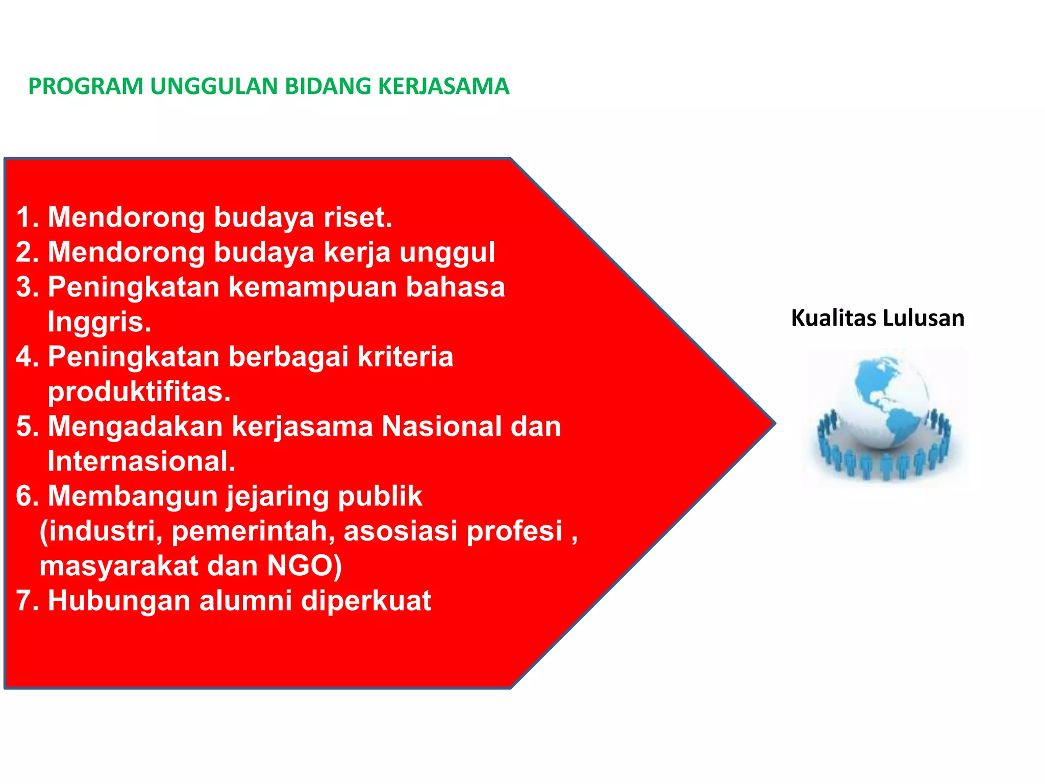 Program unggulan bidang kerjasama berfokus pada mendorong budaya riset, kerja unggul, dan peningkatan kemampuan bahasa Inggris. Selain itu, program ini bertujuan untuk meningkatkan produktivitas, membangun jejaring publik, serta memperkuat hubungan antara alumni dan kualitas lulusan. Kerjasama baik di tingkat nasional maupun internasional juga menjadi prioritas.