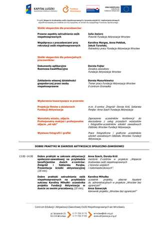 Dobre praktyki w zakresie aktywizacji społeczno-zawodowej na przykładzie beneficjentów dwóch e-centrów: Żmigród i Szklarska Poręba. Prezentacja ścieżki aktywizacyjnej (20 min).