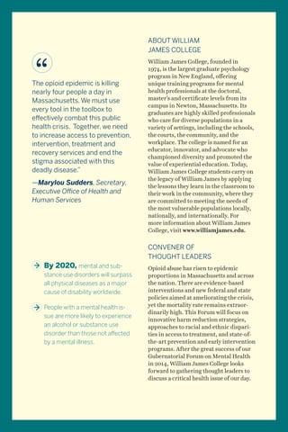 This document summarizes an upcoming public forum on the opioid crisis hosted by William James College. The forum will feature thought leaders discussing innovative harm reduction strategies, approaches to disparities in access to treatment, and prevention programs. Speakers include experts from various fields and government officials such as the Secretary of Health and Human Services. The goal is to gather experts to discuss combating the public health crisis of the opioid epidemic in Massachusetts.
