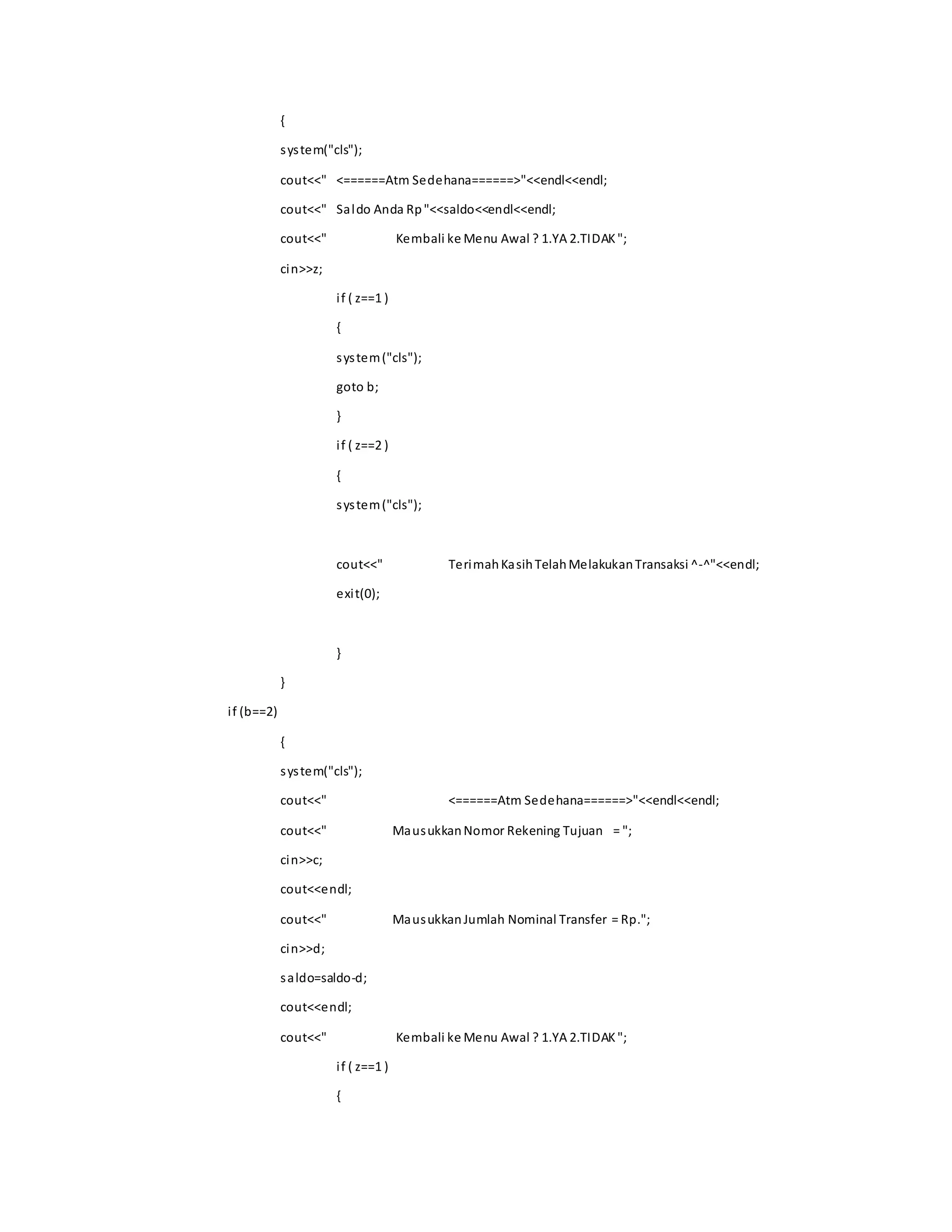 This C++ code defines an ATM simulation program with the following functionality: 1. It prompts the user to enter their PIN and verifies it for authentication. 2. Upon valid PIN entry, it displays a main menu with options to check balance, transfer funds, or withdraw cash. 3. Based on the user's menu selection, it performs the corresponding transaction and updates the account balance.