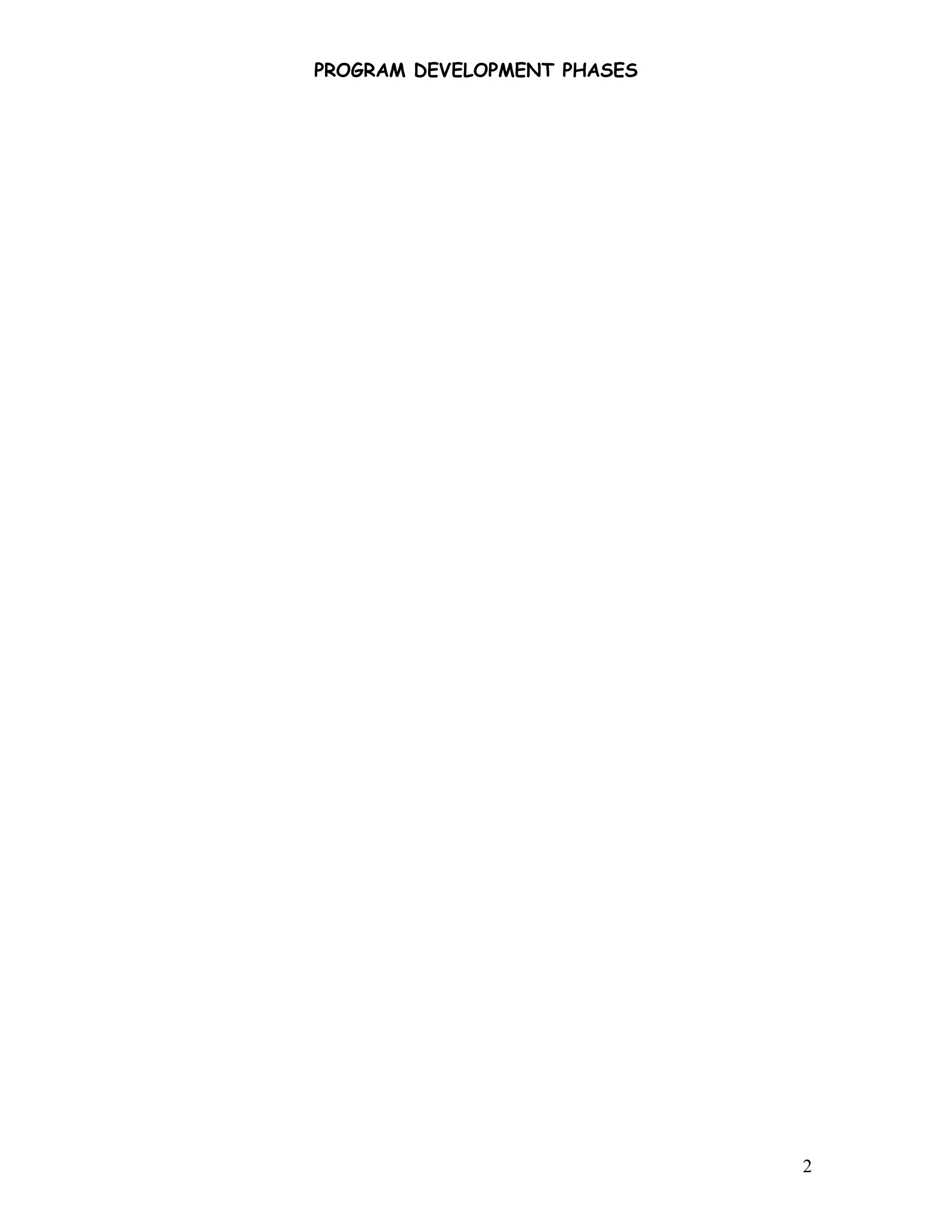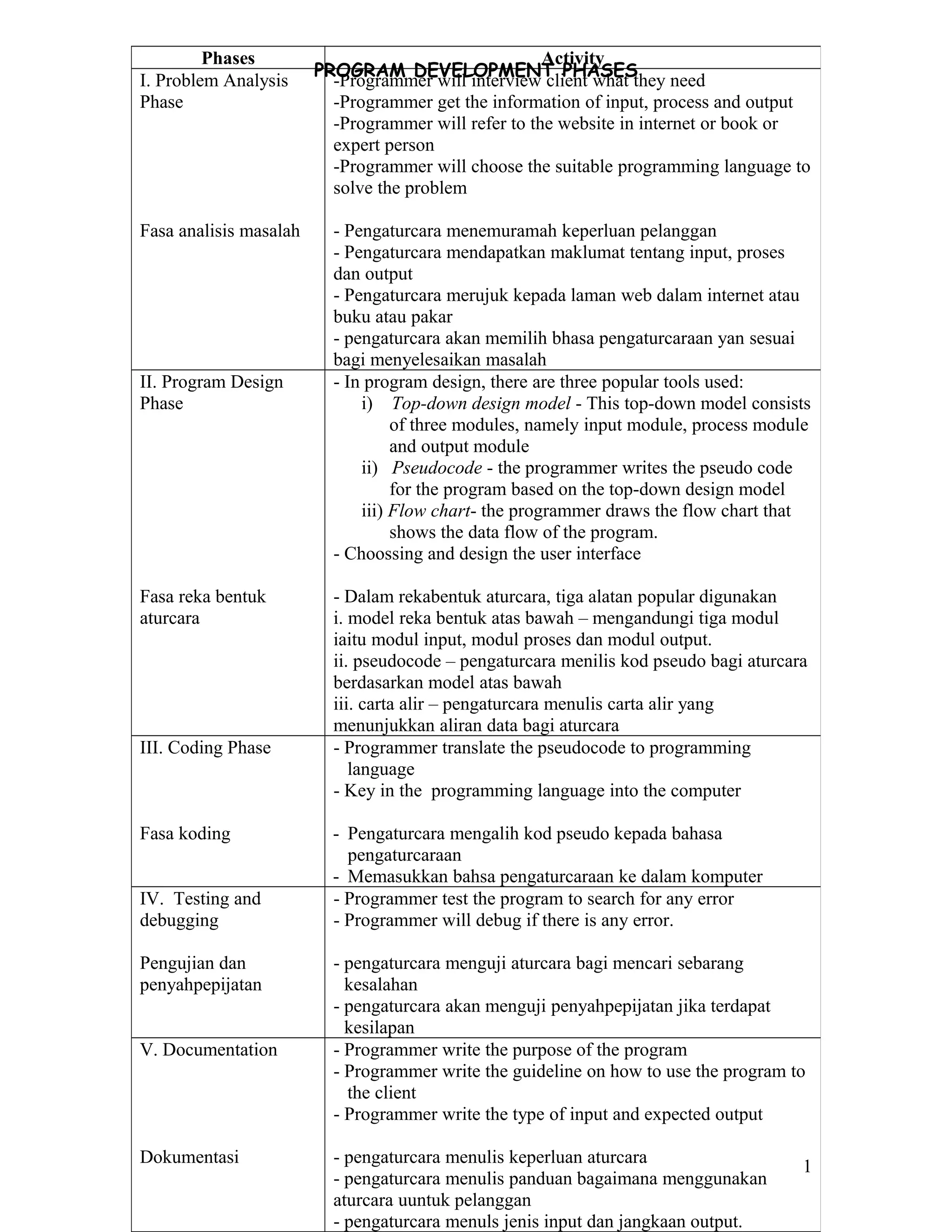 Program pengembangan melalui 5 fasa utama: (1) analisis masalah untuk memahami kebutuhan pelanggan, (2) reka bentuk program menggunakan alat seperti pseudocode dan carta alir, (3) koding menulis program dalam bahasa pengaturcaraan, (4) pengujian dan penyahpepijatan untuk mengesan dan membaiki kesilapan, (5) dokumentasi untuk menerangkan tujuan, panduan penggunaan dan jenis input-output program.