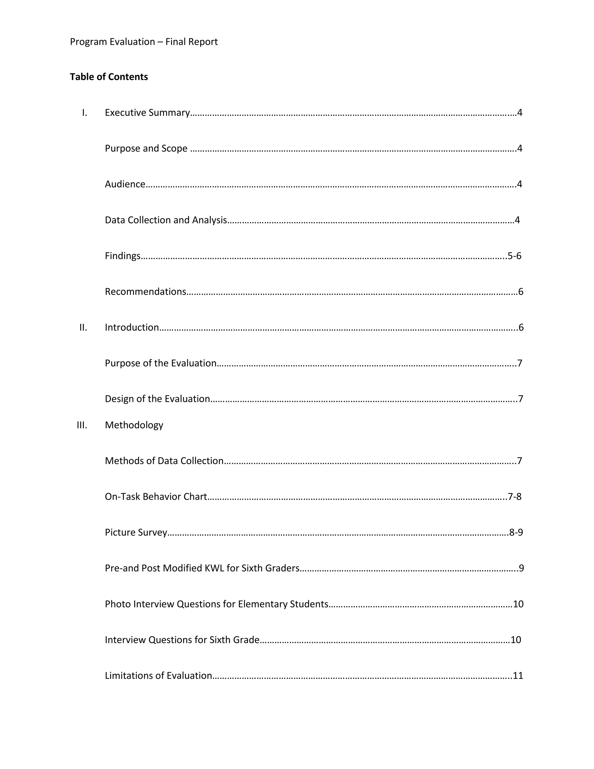 This program evaluation assessed the impact of interactive whiteboards (IWBs) in K-6 reading programs. Data was collected through student behavior logs, interviews, surveys, and photo questions from 58 students over 6 weeks. Findings showed that IWBs improved student engagement and organizational strategies. Specifically, students were on-task more with IWBs, showed increased confidence and detail in responses, and intrinsic motivation improved. The evaluation recommends continued use and expansion of IWBs in K-6 reading programs.
