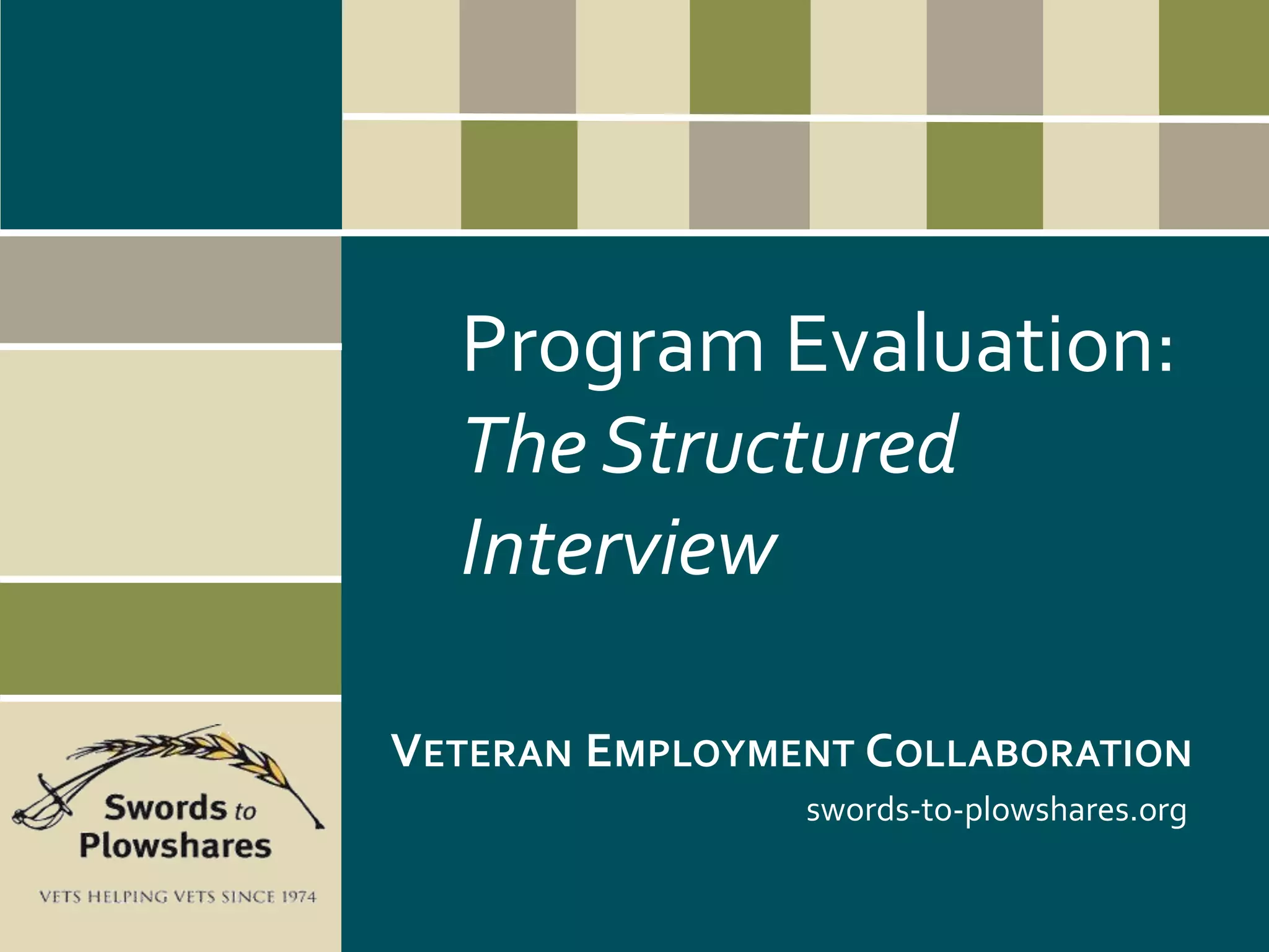 The document outlines the structured interview process for the Swords to Plowshares veteran employment collaboration program, emphasizing the importance of addressing the lingering effects of war on veterans. It provides guidelines for conducting effective interviews, gathering data, and ensuring culturally responsible approaches while aiming to restore dignity and self-sufficiency among veterans. Additionally, it highlights the significance of stakeholder input, best practices in research methodology, and the careful design of questions to gather richer data.