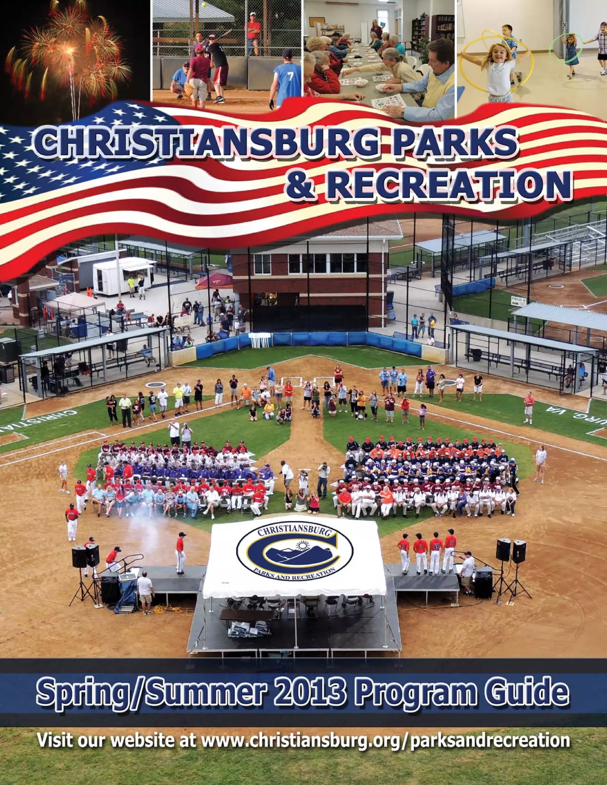The document is a brochure from the Christiansburg Parks and Recreation Department promoting their recreational programs and facilities for citizens. It provides an overview of the department's mission to enhance community members' quality of life through leisure programs. It describes the various indoor and outdoor recreational opportunities available, including sports facilities, fitness classes, educational programs, and special community events. The director, Brad Epperley, welcomes residents to take advantage of the resources and looks forward to continuing to improve recreational experiences for the town.