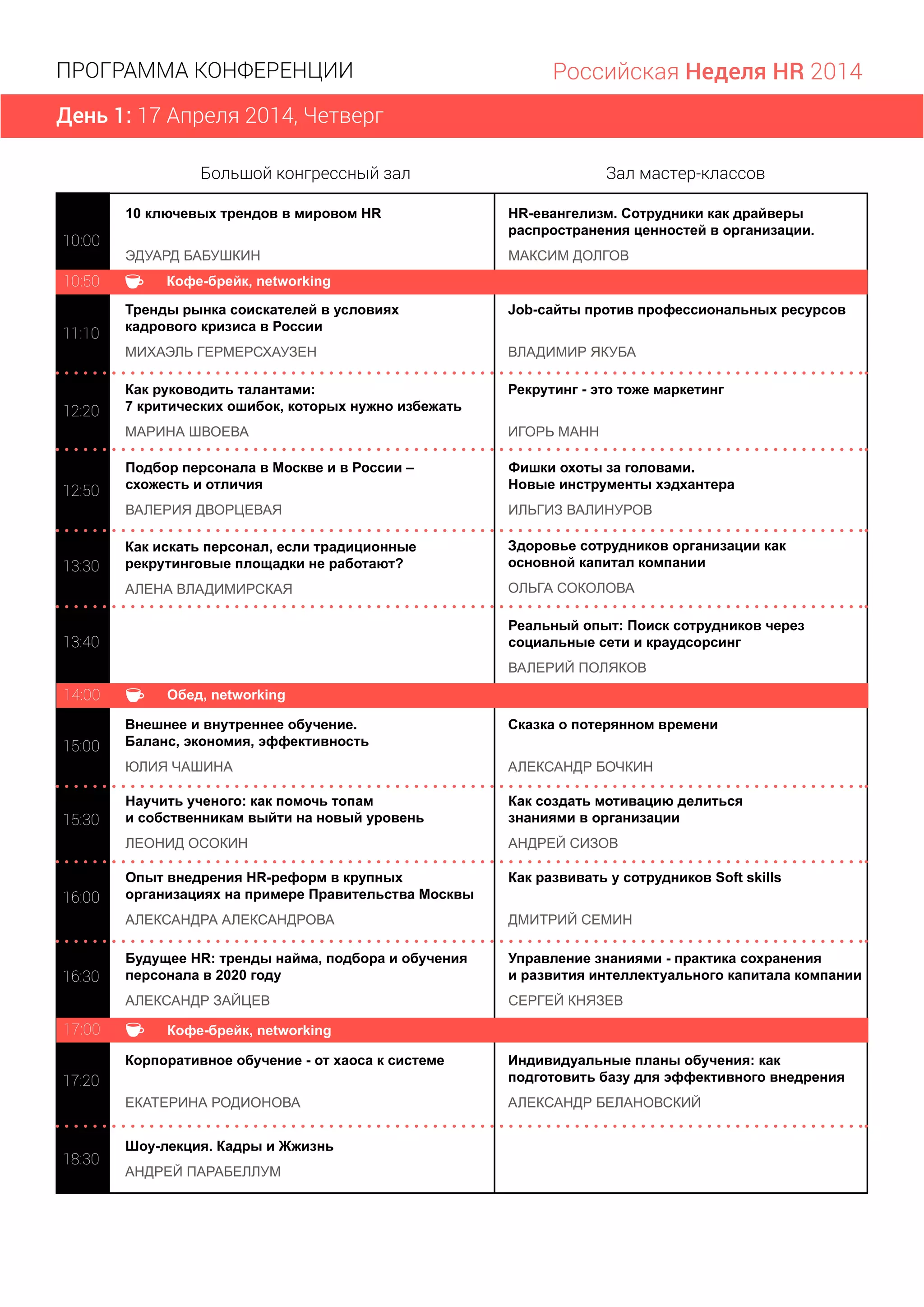 Документ представляет собой программу конференции 'Российская неделя HR 2014', которая включает множество тем, касающихся управления человеческими ресурсами, таких как тренды в HR, рекрутинг, мотивация сотрудников и корпоративное обучение. Конференция проходит в три дня и включает как лекции, так и мастер-классы с участием различных экспертов в области HR. Участники смогут обмениваться опытом и наращивать сеть контактов через сессии networking.
