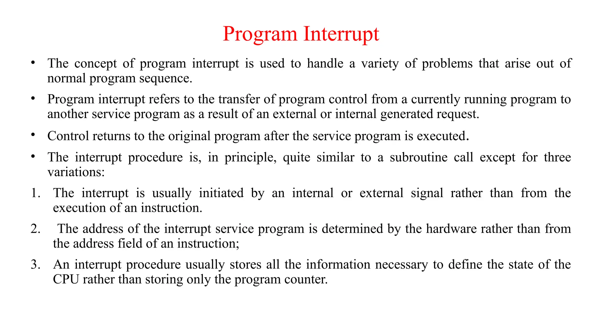 • Program interrupt refers to the transfer of program control from a currently running program to